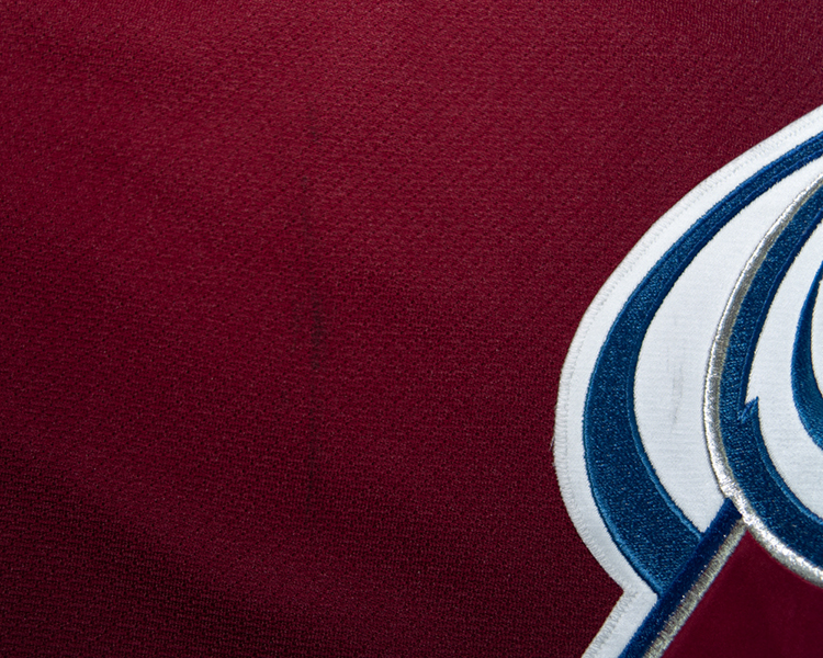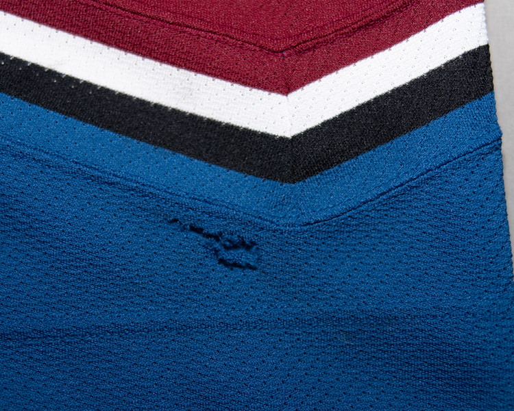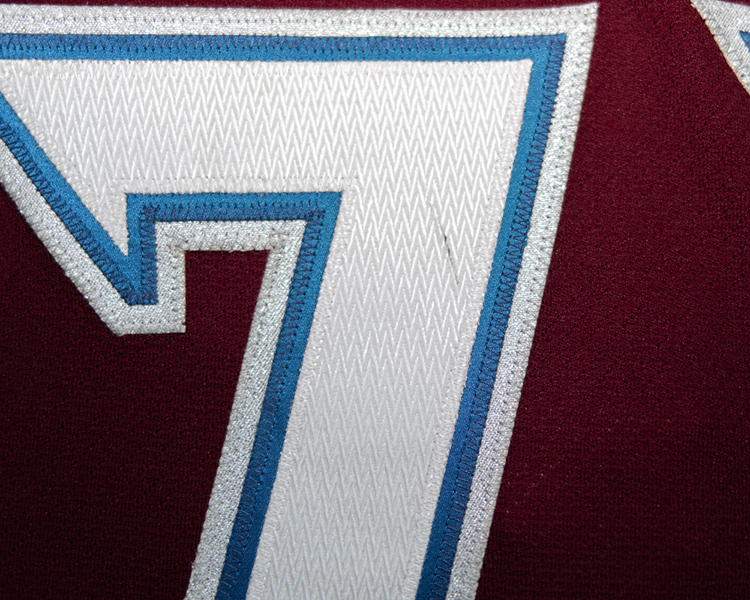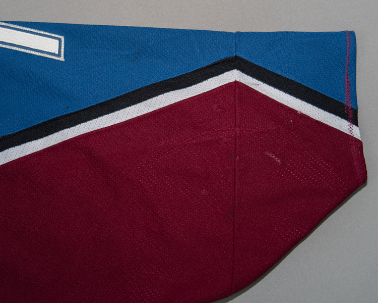 The jersey shows pretty good overall wear. The lower sleeves have a number of small burns and scuffs. The dominant marks in the body are a large horizontal black mark just above the front hem piping, a vertical black mark to the right of the crest, and a smallish mark on the back 7. Both sleeves have been shortened and the cuffs tapered in, according to the common Bourque specifications. The jersey features the 2001 All Star patch on the right chest and the Assistant Captain's A on the left chest. The Avalanche set tag is located in the rear hem, and indicates the second set.