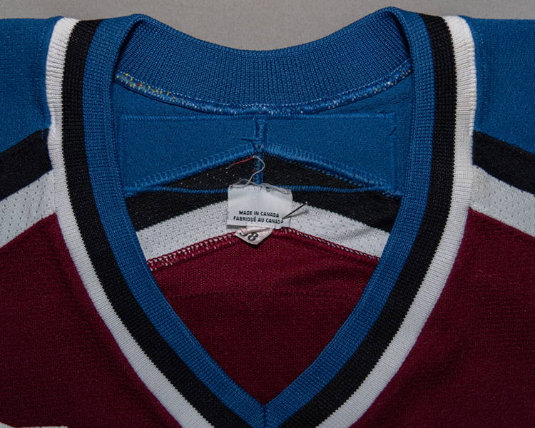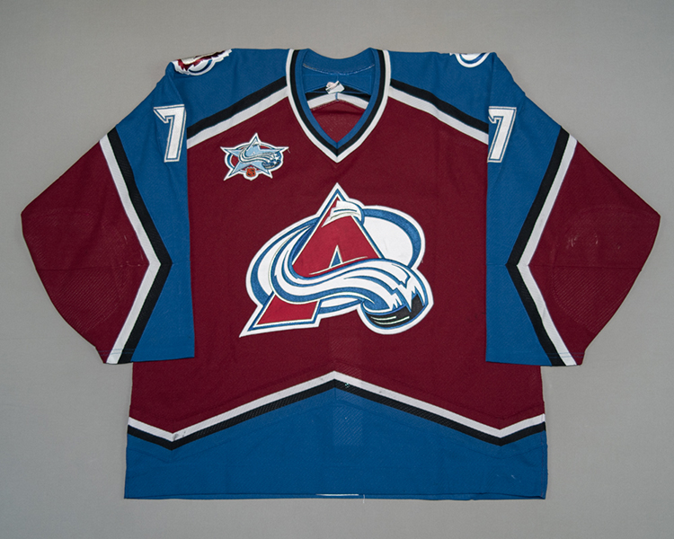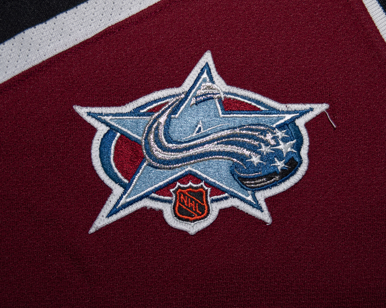 The jersey is from the first team set, and contains the Avalanche set tag in the rear hem. The jersey shows light-to-moderate wear. The sleeves have been slightly tapered at the cuff. This is the first year the Avalanche used CCM airknits, with the road jerseys sporting the KOHO logo. The KOHO logo is located on the rear collar. The jersey has the 2001 All Star patch on the right chest. The jersey shows lighter game wear, but does have some black marks and light board burns on the lower arms. There are also some black marks in the lower front body, as well as a couple of prominent marks around the hem. The crest shows a couple of marks as well. The jersey is accompanied by the Avalanche LOA.