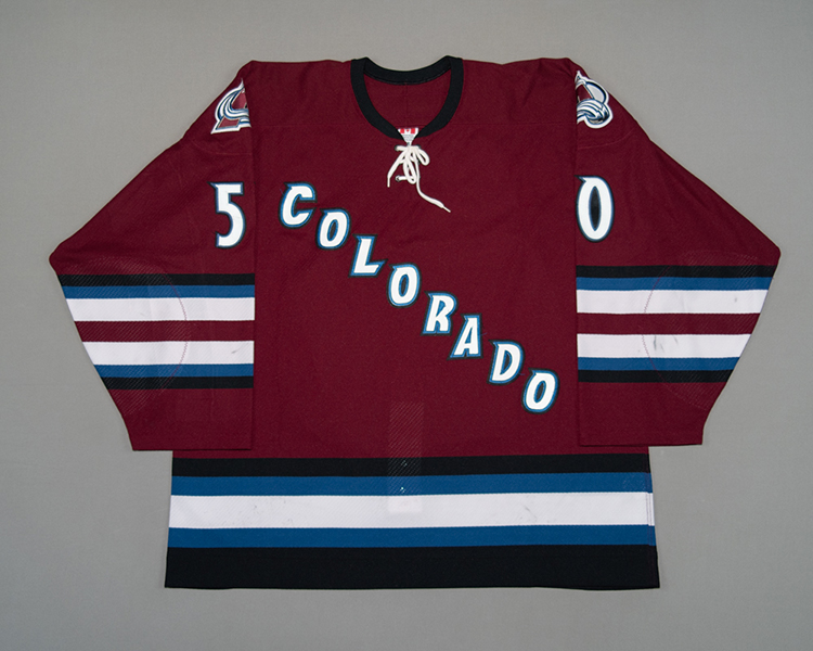 The jersey is from the first set of alternates, which were worn as a set for five games. It is tagged set "I-1". It displays the tie-down style neck, and shows decent game wear for only being worn in three of the five games. Black marks are most visible in the white striped portions of the shirt. Both sleeves show a number of marks, and the lower front body also displays an array of stick marks.The jersey is accompanied by the Avalanche LOA.