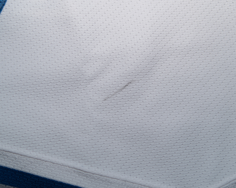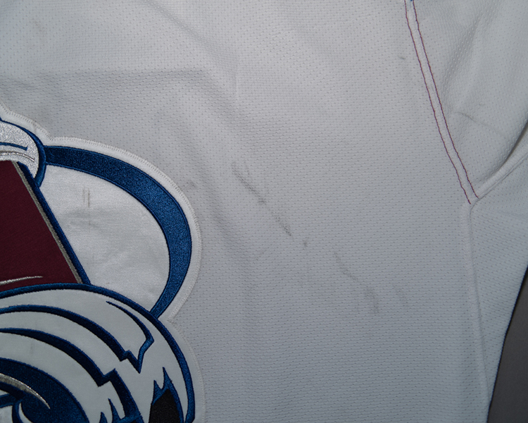 This jersey shows nice game wear, with small black marks throughout the shirt. Many of the marks are concentrated in the lower arms, with a couple of larger brush-type marks toward the front hem. The right elbow sports a small unrepaired slice. The numbers show some slight fraying around the edges. The jersey is accompanied by the MGG-NHL documents.