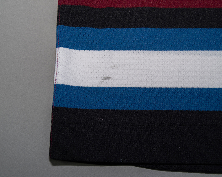 TThis alternate is from the first of two sets, and according to statistics, was worn five of the six games this set was used. The jersey shows predictably lighter wear, with marks in the sleeves, and a decent blue board scuff in the left elbow area. There are a few light marks in the rear numbers. Close examination under the light shows random marks throughout the burgundy portions of the shirt. The jersey is accompanied by the Avalanche LOA.
