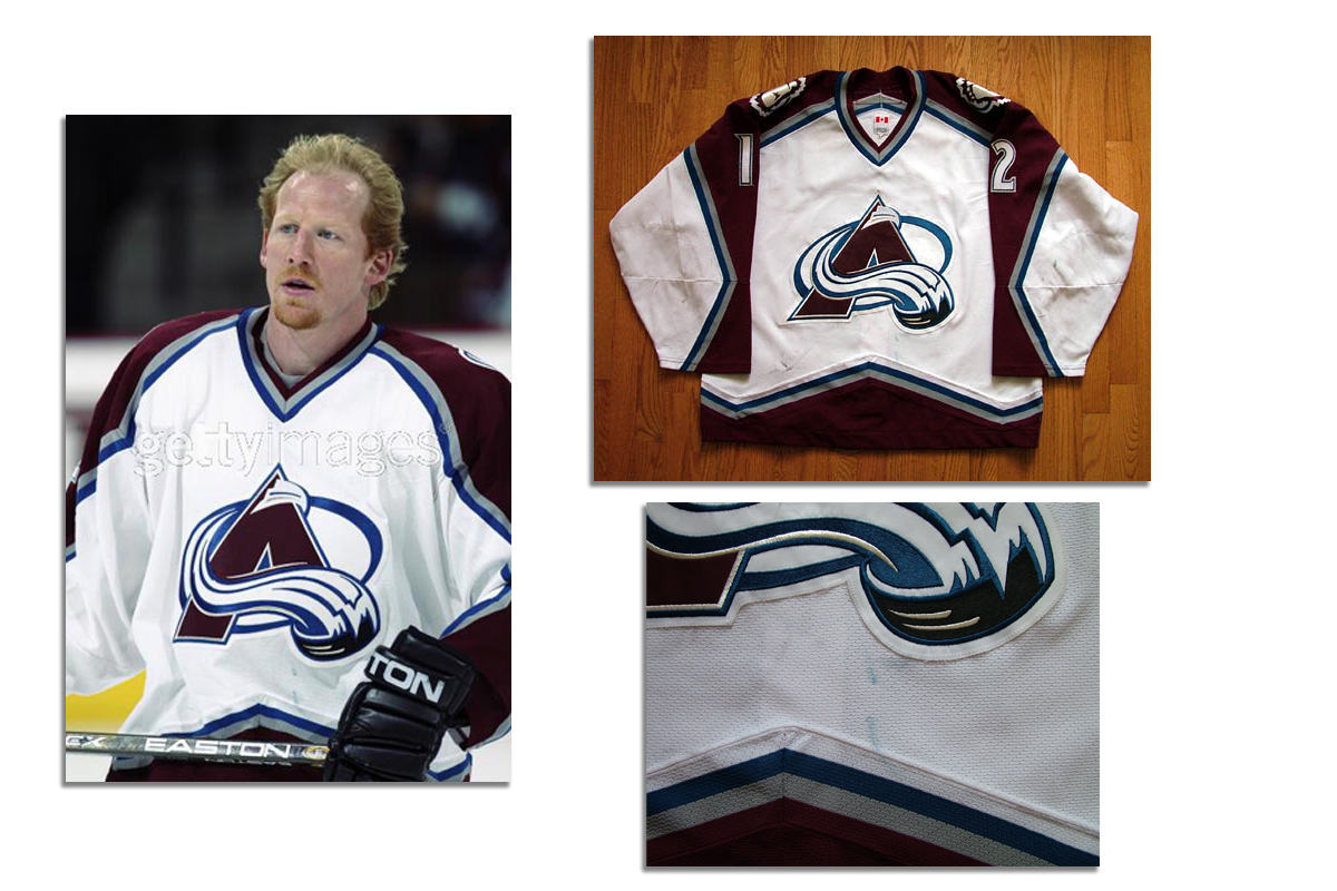 Good overall wear with a variety of marks throughout the shirt. The front body shows good multi-colored markes below the crest, with a couple of blue marks that provide a photo match. Both sleeves ahve good markings in the lower arms. The body has been turned under and sewn to shorten the jersey roughly one inch. The NHL shield shows upside-down on the inside, while the MHL-MGG tag is sewn in right-side up, after the alteration. Overall, a nicely worn shirt. Accompanied by NHL-MGG LOA.