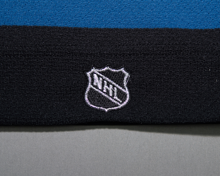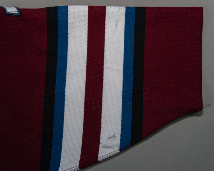 Being an alternate, this jersey shows predictably lighter wear, and was worn a total of six games. The shirt does show some nice black marks however, with some nice marks on the sleeves and some very good marks in the front hem stripe. An interesting item on this jersey is the way the loose strings on the neck lace have been cut to length and knotted at the ends. The Meigray tag is sewn in the rear hem, and the jersey is accompanied by the NHL-MGG LOA.