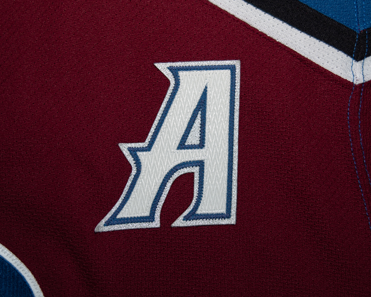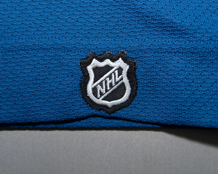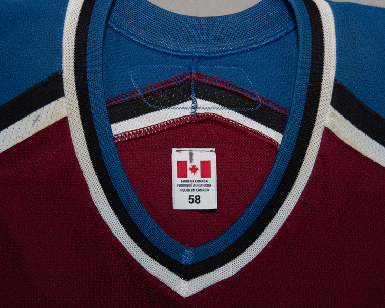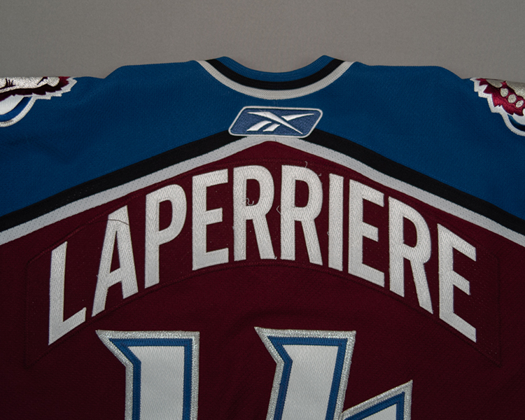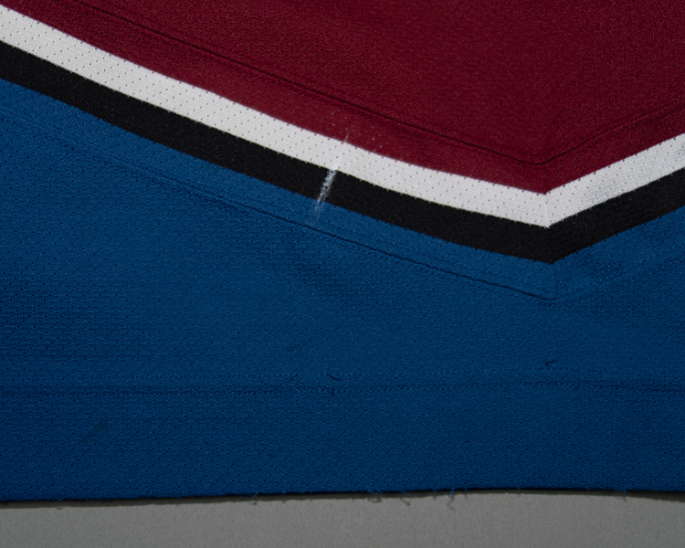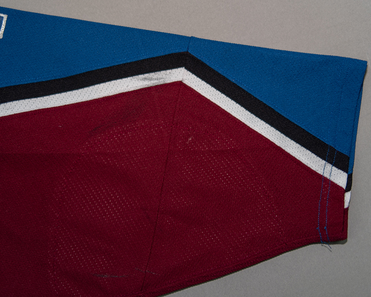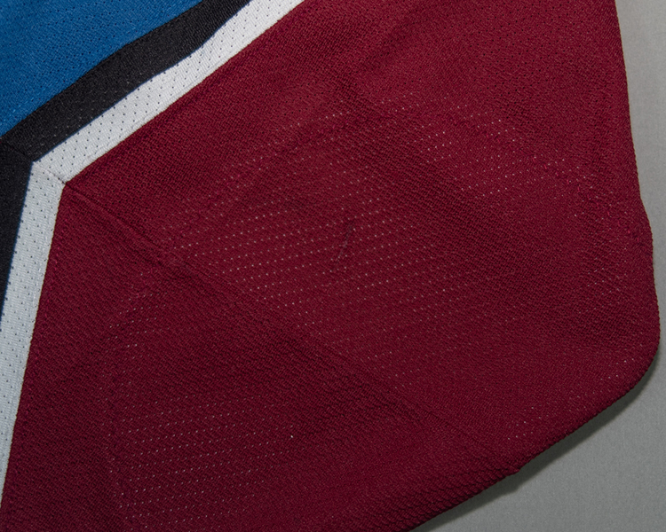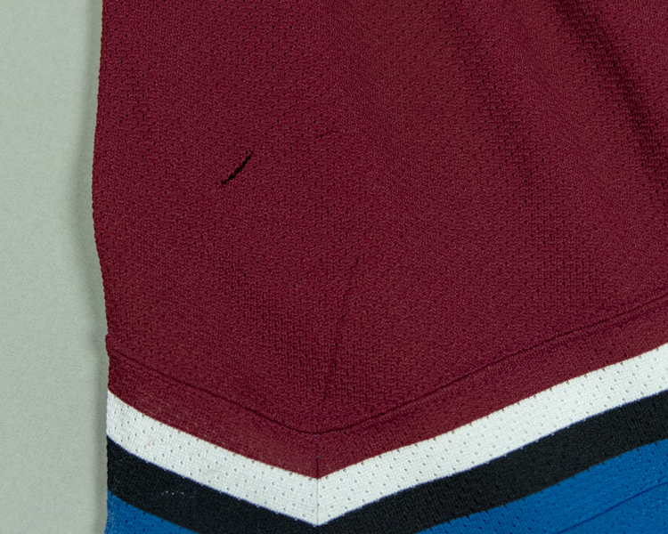 This jersey, from the first year of the "New NHL", shows lighter wear on the burgundy fabric, but does have a few decent wear items. The "v" seam of the collar has been torn and repaired nicely, using the appropriate color thread for each color in the piping. Black scuffs can be detected in the elbow and forearm area of each sleeve, as well as random nicks and small marks in the shoulder areas. There are two small cuts in the lower right side below the crest. The Assistant Captain's "A" has been heat pressed to the jersey, but not sewn around the edges—Laperriere did not start the season as an Assistant, however was made so due to a serious injury to Steve Konowalchuk. So this jersey was first worn without the letter, but most of its game time came after the letter was added. The Meigray tag is sewn in the rear hem, and the jersey is accompanied by the NHL-MGG LOA. This season's jerseys are tagged "04-05" as the jerseys were prepped prior to the lockout—an additional tag has been sewn next to the set tag designating the jersey as having been worn in 05-06 instead.