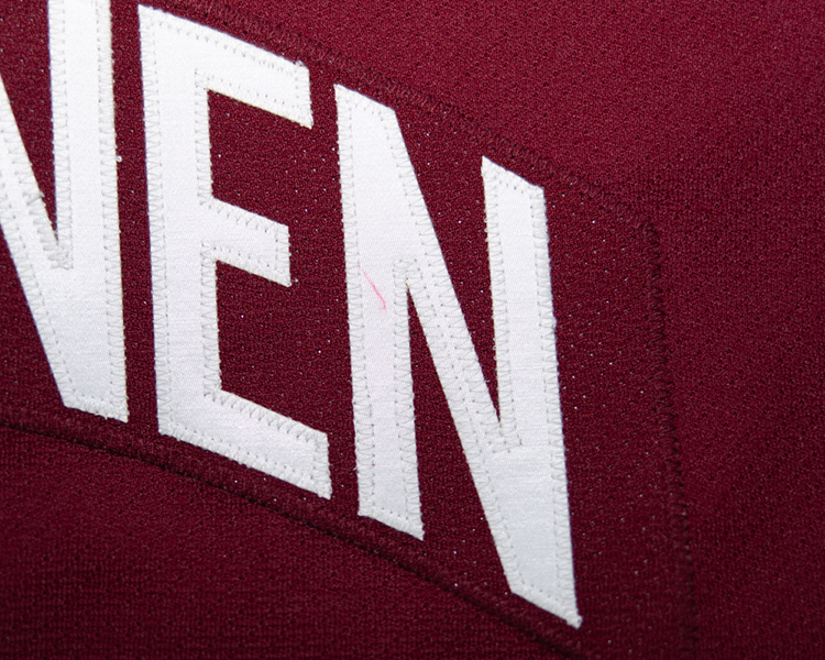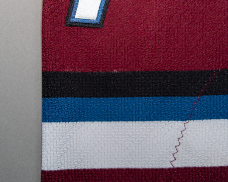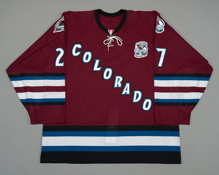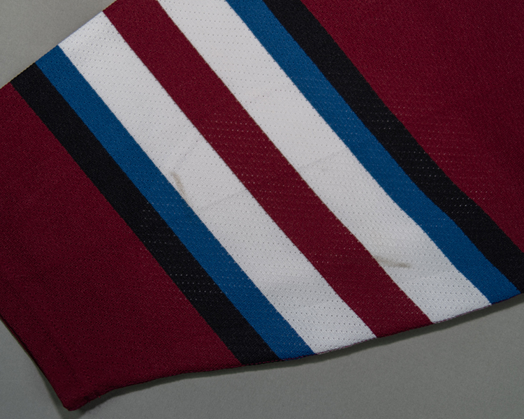 This jersey shows very light wear with a few light scuffs and marks in the lower sleeves. The Avalanche ten-year anniversary patch is located on the left chest. The Meigray tag is sewn in the rear hem, and the jersey is accompanied by the NHL-MGG LOA. This season's jerseys are tagged "04-05" as the jerseys were prepped prior to the lockout—an additional tag has been sewn next to the set tag designating the jersey as having been worn in 05-06 instead.