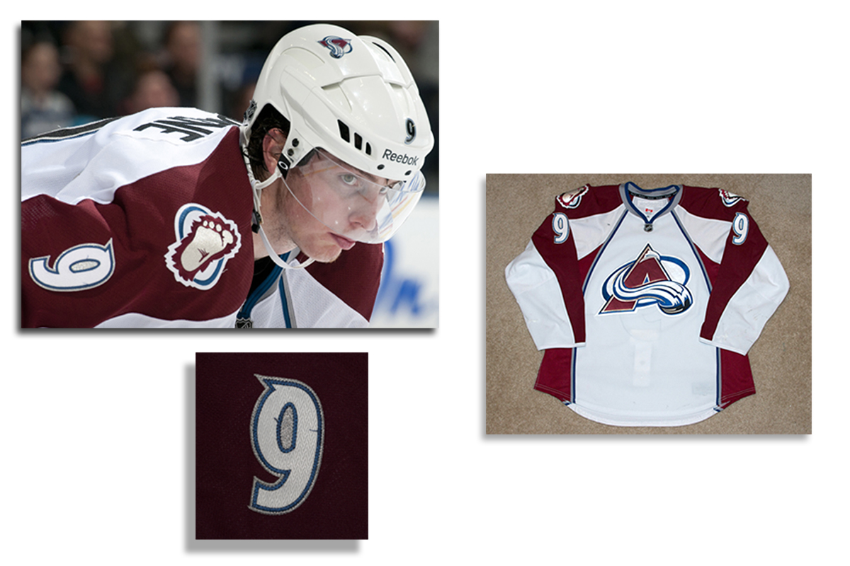 This jersey is from the first team set of road jerseys, with no additonal marks in the neck. The jersey shows very good wear in the sleeves, with a couple of very distinguishable marks on the body. The jersey has been photo matched to some loose threads and marks on the left sleeve and sleeve number. The jersey is also the one worn by Duchene for his highlight-reel goals against Dallas on Nov. 4, 2011 and Nov. 15, 2011 at Pittsburgh, as well as his first career hat trick in the Nov. 4 game at Dallas. The jersey is accompanied by the team/MGG LOA.