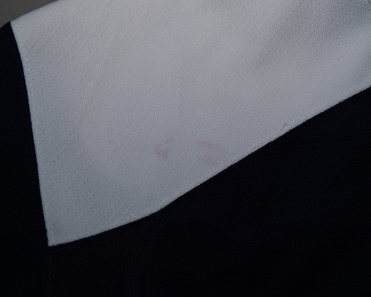 Second, and last season of this style alternate jersey. This jersey is from the only team set made available to the public (a second set worn for limited games was kept for the players). Unique to this alternate is the NHL 100-year anniversary patch, worn by all teams on the right sleeve after January 1. The jersey shows light overall wear, with some reddish discoloration, possibly post paint, in the right shoulder area. There is also a moderate amount of pilling in the hem areas and a few small material snags throughout. A couple of light board burns are visible on the lower sleeve. The jersey is accompanied by the Avalanche COA.