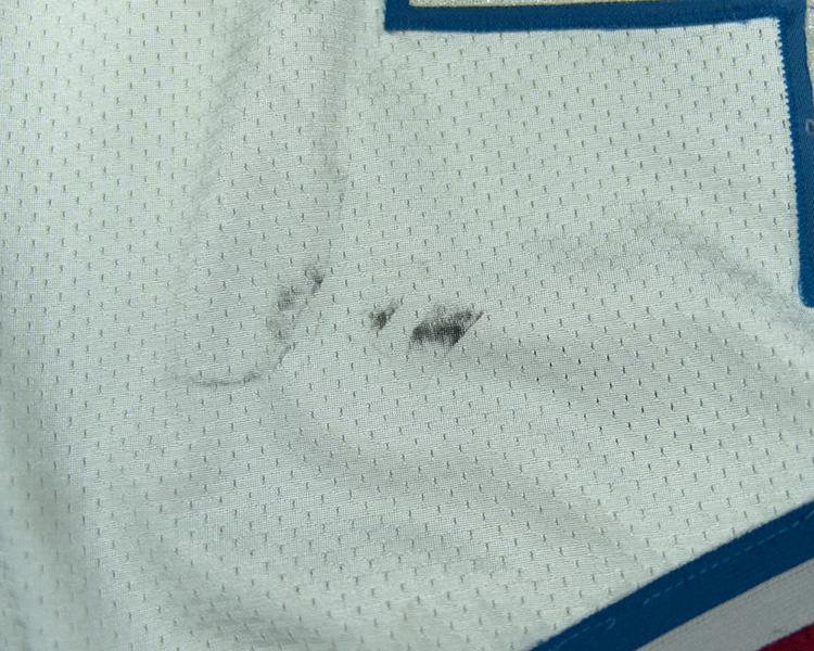 This jersey was acquired from the Colorado Avalanche during one of their first jersey auctions at McNichols Arena in March 1996. Although none of the first-year jerseys had a set mark, this jersey is believed to be from the first regular season set. It was rumored that the first jerseys were not holding together very well, which can be seen in the unraveling seams on this jersey. Another interesting point on this jersey, which is typical of the first Avalanche jerseys, is that the nameplate is not cut to shape very evenly, suggesting that the plate itself was hand cut. Also note the smaller crest, stylized letters, and blocked Starter logo on the first-year jerseys. The jersey shows very good game use, with numerous marks, small tears and burns throughout. Of note is the excessive wear on the sleeve numbers, where the texture on the face of the numbers is frayed from use. The front of the jersey has several very good black marks. The jersey comes with the Avalanche notarized LOA that accompanied all of the auctioned jerseys.