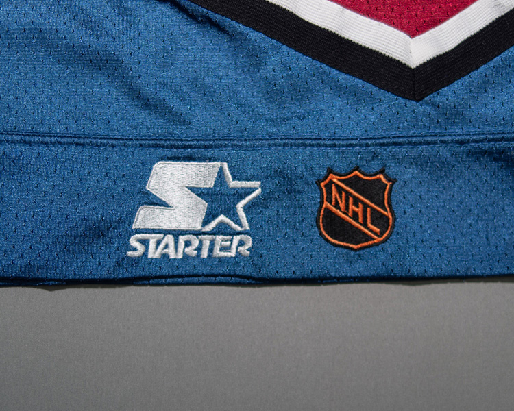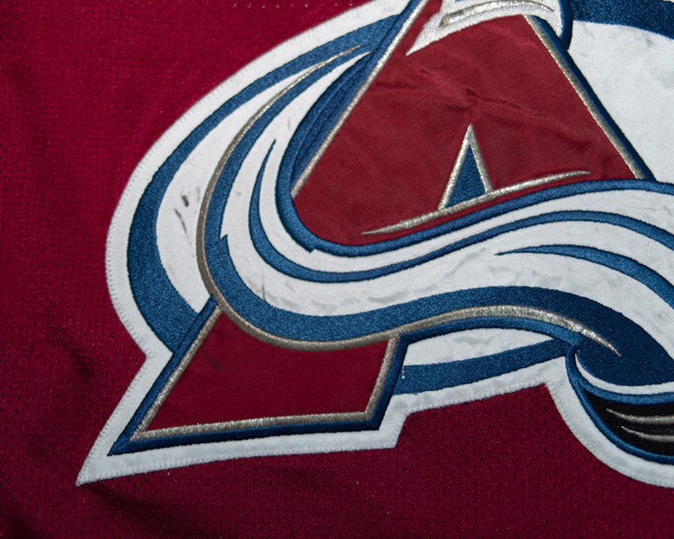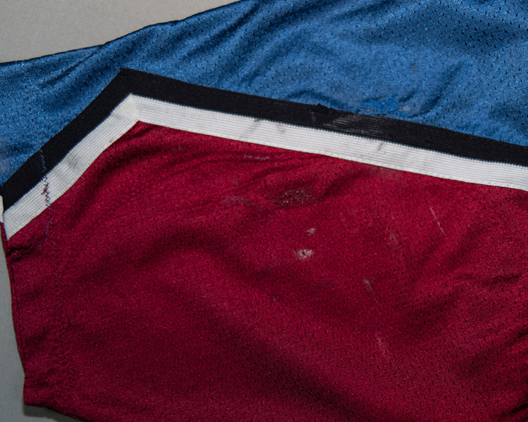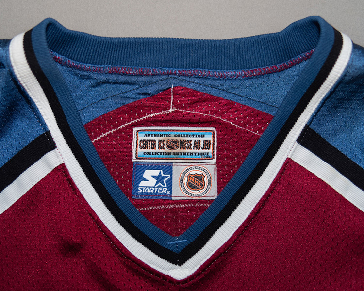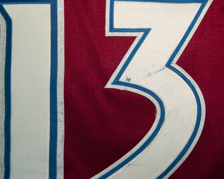 The sleeve numbers are a combination of layering, with the 1's being the inlaid style that was phased in this season, and the 3's being the traditional top-down style. The neck tag shows the very faint remnants of the set "2" marking .The jersey shows very good game wear, with some large repairs on both sleeves. The crest and front body shows numerous stick marks. The rear "3" shows some blue board marks. There is a nice unrepaired tear close to the hem on one side. The repairs on the sleeves are heavily stitched with jersey material backing the repair. The jersey is accompanied by the Avalanche LOA, as well as Meigray registration documents.