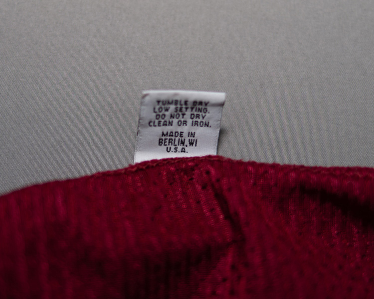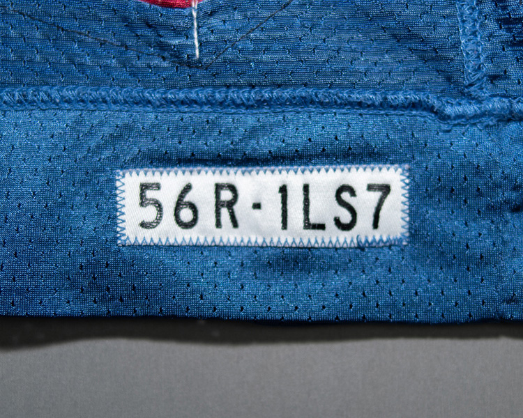 One curiosity of this jersey is that the number "1" on the back is cut slightly wider than normal, and looks to just be some kind of factory error, since the attachment stitching on the inside of the shirt connects both the "1" and the "3" to each other, indicating they were both sewn on at the same time at the factory.