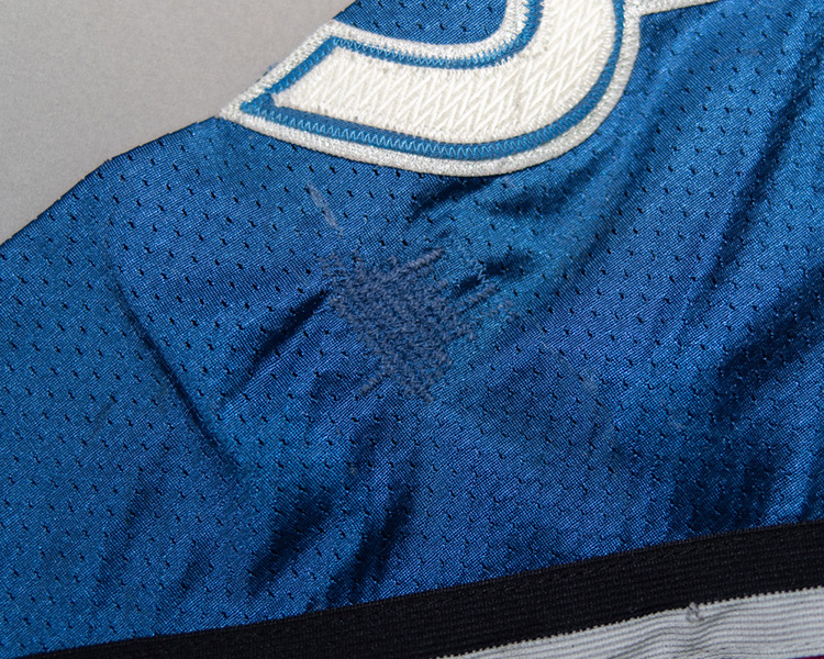 This jersey was acquired from a private owner via consignment to Meigray. The jersey shows the typical nuances of the 96-97's, specifically the slightly straighter nameplate, wrinkling and puckering of the crest, and the size tag located in the rear hem. The sleeves have also been shortened slightly.