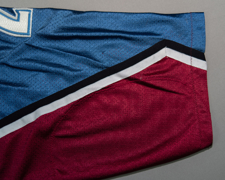 This jersey was consigned to Meigray from a private collector. The jersey has all the nuances of the 96-97 jerseys, including the size tag in the tail. The sleeves have been shortened drastically. As in other 96-97's, the washing tag is a single tag with the second tag removed. The neck tag contains the set number "2" in marker, and is smudged, as with other set 2's. The Assistant Captain's "A" is located on the left chest, and appears to have been removed and attached a few times, as evidenced by the rough edges and stitching. The jersey shows moderate game wear, with random small stick marks and board burns around the body and sleeves. It has some heavier black marks in the lower left portion of the front body, and a noticeable black mark in the middle fo the rear "2". There is a snag-type hole in the front hem. It also has two smaller team repairs in the left elbow. A curiosity of this jersey is a defect in the inner shoulder seam, in which the sewing machine has grabbed a small amount of fabric and pinched it into the seam. The jersey is accompanied by the Avalanche LOA and Meigray documentation.