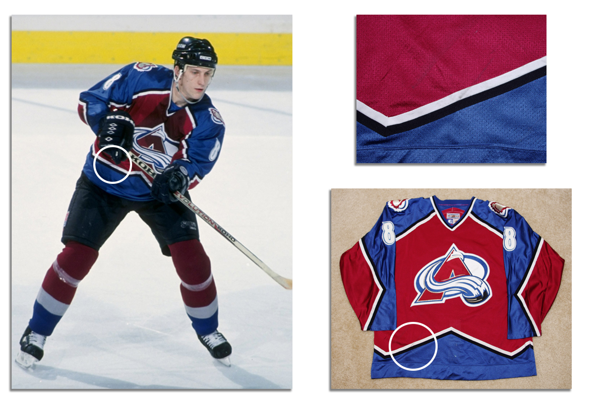 This jersey shows moderate game wear with random stick marks scattered around the body. The right sleeve shows a couple of fabric-backed repairs near the cuff. The jersey does not display any alterations. The set 2 marking in the collar is nearly smudged out, which is typical of this set of jerseys. The jersey has been photomatched to a black slash mark on the lower front body.