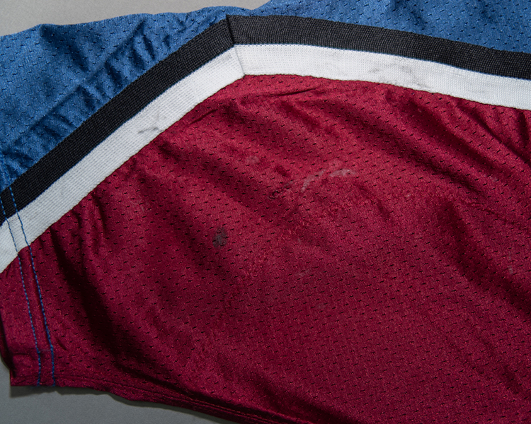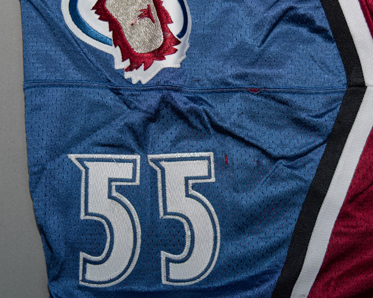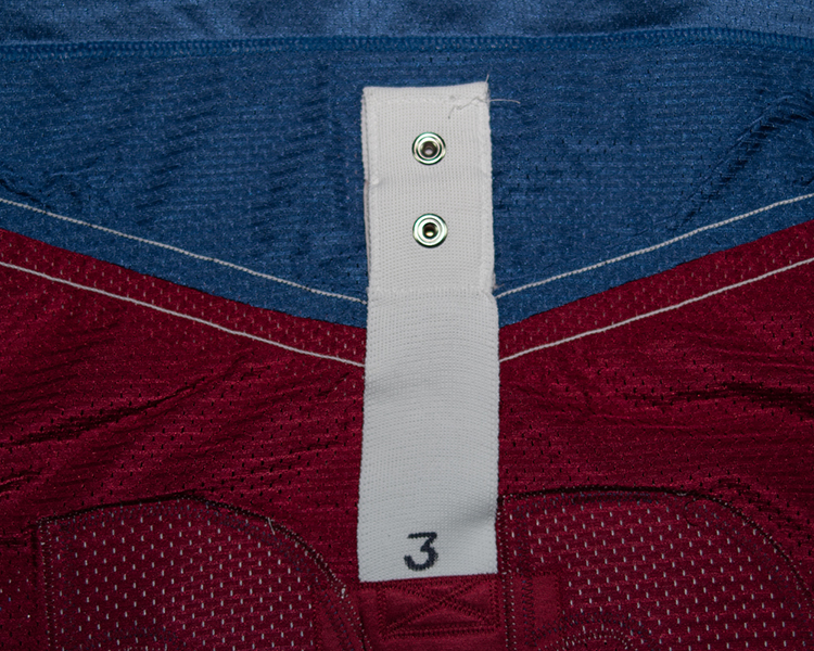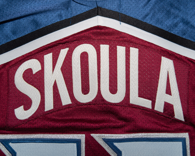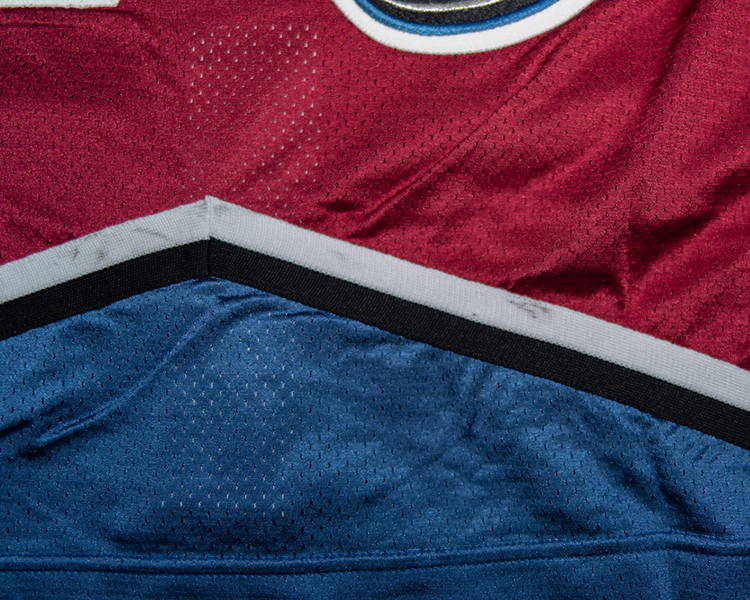 This jersey is a true rookie jersey, as Skoula's 80 games this season were his first in the NHL. The jersey shows light to moderate wear. It is tagged set "3" on the fight strap, and is marked with an "N" by the trainer in the collar. As with all 99-00's, it has the "NHL 2000" patch on the right chest. The jersey shows light to moderate game wear with a few random marks throughout the body. It has some good marks, burns, and small holes in the shoulder. It also has some stick/board work on the lower sleeves. The jersey is accompanied by the Avalanche LOA and Meigray documentation.
