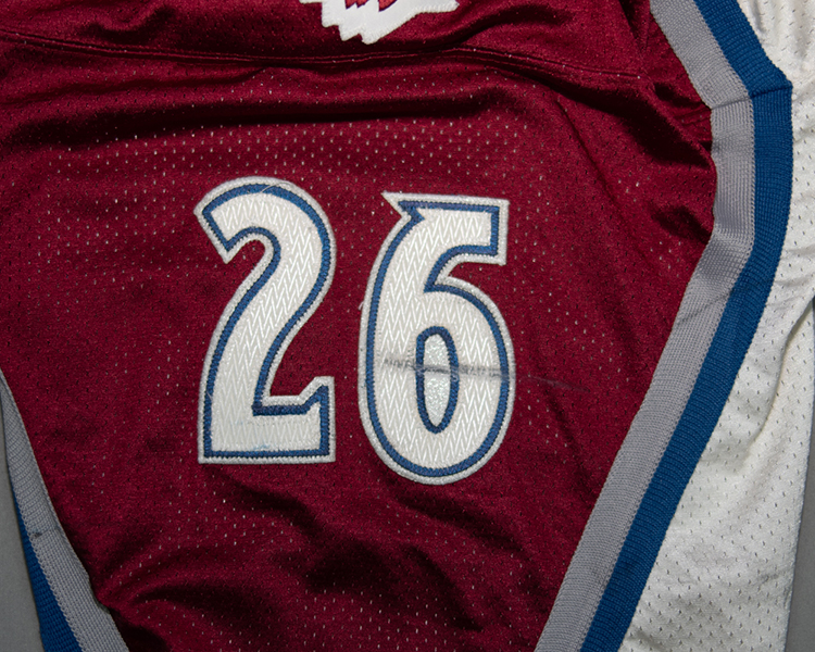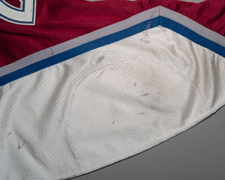 This jersey shows very good game wear. It is tagged set "3" on the fight strap, and is marked "I" in the collar. As with all 99-00's, it has the "NHL 2000" patch on the right chest. The jersey shows very good game wear, with numerous marks throughout the jerseys and several unrepaired tears and board burns in the arms. It has a very nice stick mark that cuts into one of the sleeve numbers. The jersey is accompanied by the Avalanche LOA and Meigray documentation.